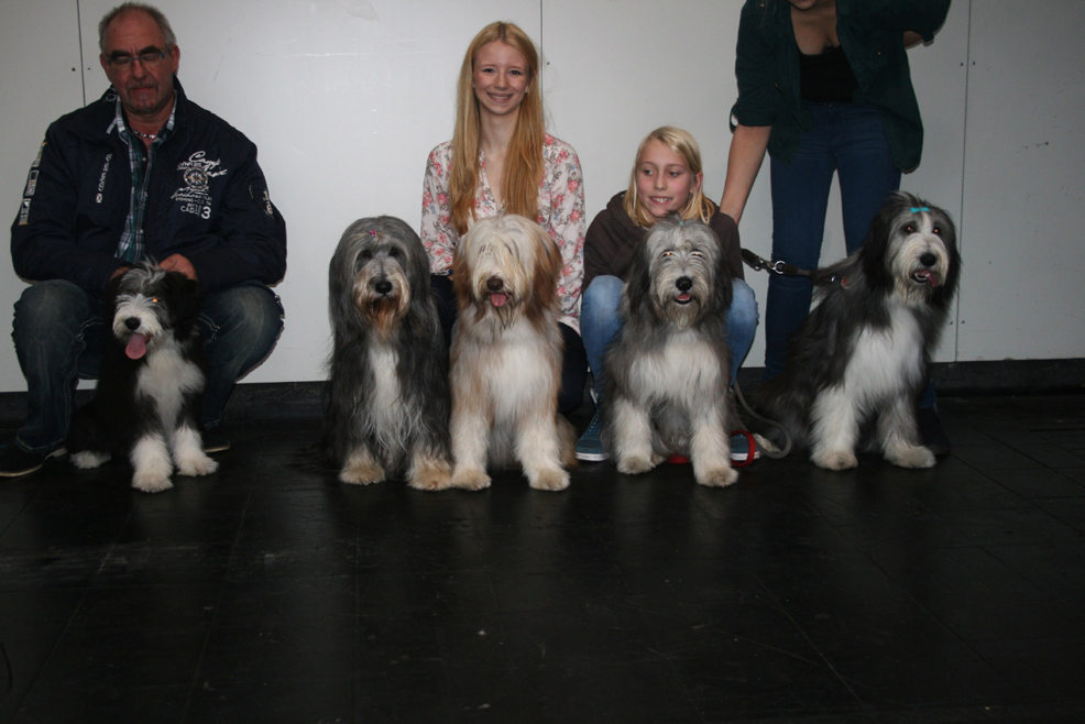 from left to right: Bonnie, 4 months old "Full of the Dickens Not Guilty", Audrey and 3 of her daughters, Pearl, Lola & Motte.