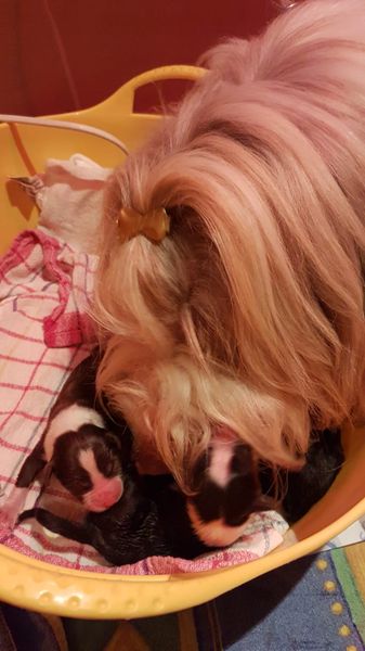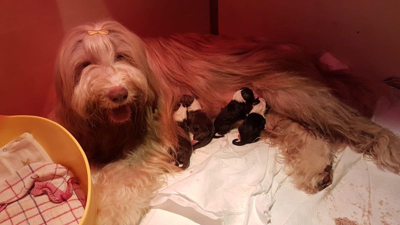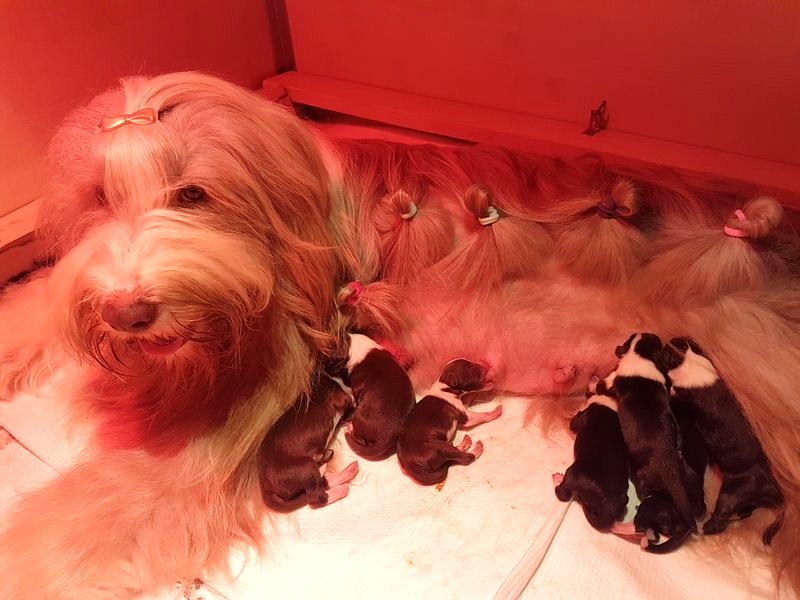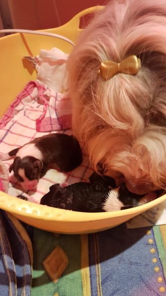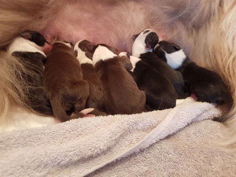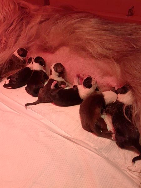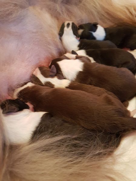 Harriet has 7 puppies of which 2 are males. One is a black/white and one is a brown/white.